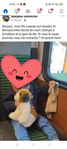 info Bonjour mon fils a perdu son doudou St Bernard entre l'école de court champs a Echallens et la gare du leb. Si vous le trouvez pourriez vous me contacter au 077 409 90 19? Je vous remercie sincèrement Margaux Catégorie doudous perdus Canton Vaud Ajouter un commentaire Votre nom Email de Contact Commentaire À propos des formats de texte Plain text Les lignes et les paragraphes vont à la ligne automatiquement. Laisser ce champ vide