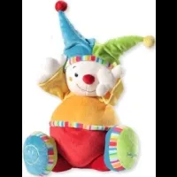 Petit clown 10-15cm bien usé pantalon rouge et top jaune vert, à des points rouges sur sa figure.