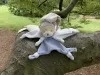 Doudou ours bleu (patte) trouvé au parc des Eaux-Vives, mercredi 26.08 vers 20h, près du restaurant. Je l’ai laissé sur la branche d’un arbre... (arbre dont une des branche s’est replanté dans la terre et repart en deuxième arbre).