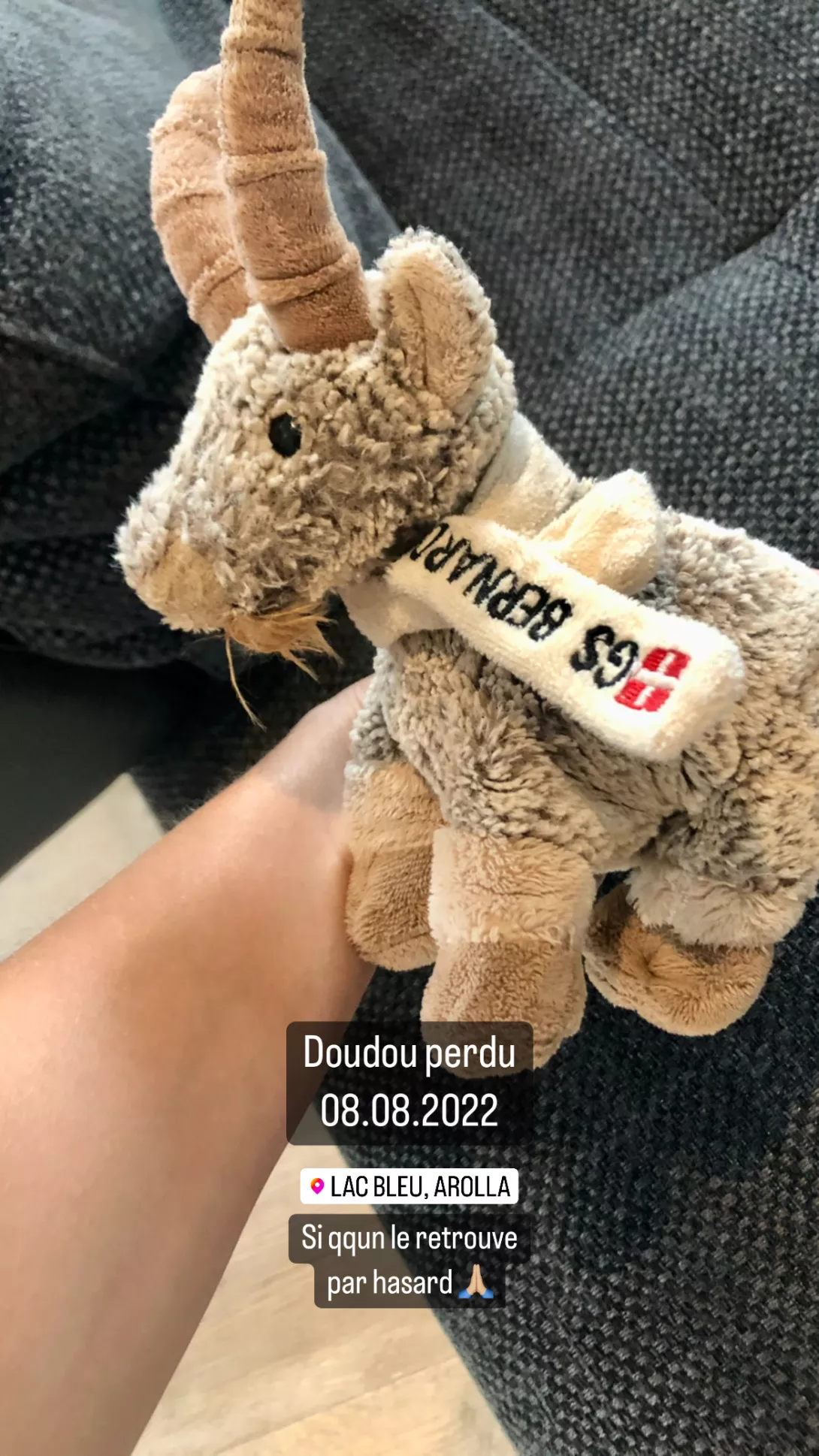 info Perdu sur le sentier menant au Lac Bleu vers Arolla VS Catégorie doudous perdus Canton Valais Ajouter un commentaire Votre nom Email de Contact Commentaire À propos des formats de texte Plain text Les lignes et les paragraphes vont à la ligne automatiquement. Laisser ce champ vide