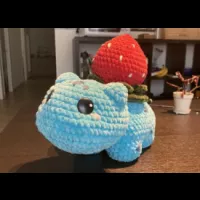 Grosse peluche Bulbizarre avec fraise sur le dos.