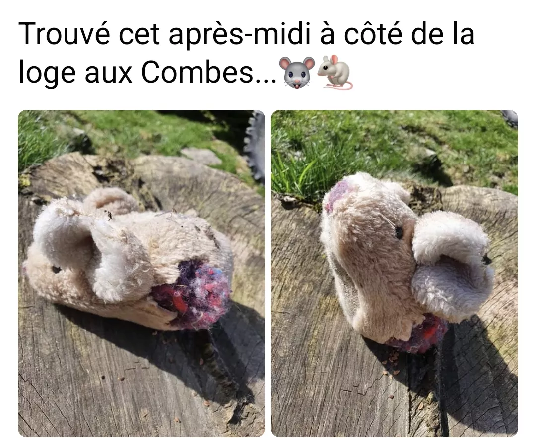 info Trouvé à côté de la loge aux Combes, dans le pâturage en-dessus de la Combe à la Biche, vers le Mont-Soleil. Catégorie doudous trouvés Canton Berne Ajouter un commentaire Votre nom Email de Contact Commentaire À propos des formats de texte Plain text Les lignes et les paragraphes vont à la ligne automatiquement. Combien font trois plus trois CAPTCHA Math question (1 + 0 =) Trouvez la solution de ce problème mathématique simple et saisissez le résultat. Par exemple, pour 1 + 3, saisissez 4. Cette question sert à vérifier si vous êtes un visiteur humain ou non afin d'éviter les soumissions de pourriel (spam) automatisées. Laisser ce champ vide